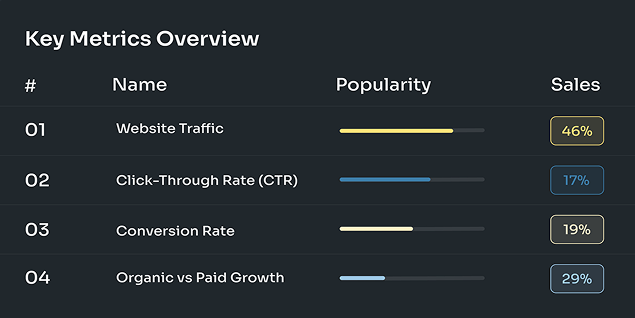 We track key performance indicators(KPIs) such as website, conversion, click-through rates (CTR), ROI.